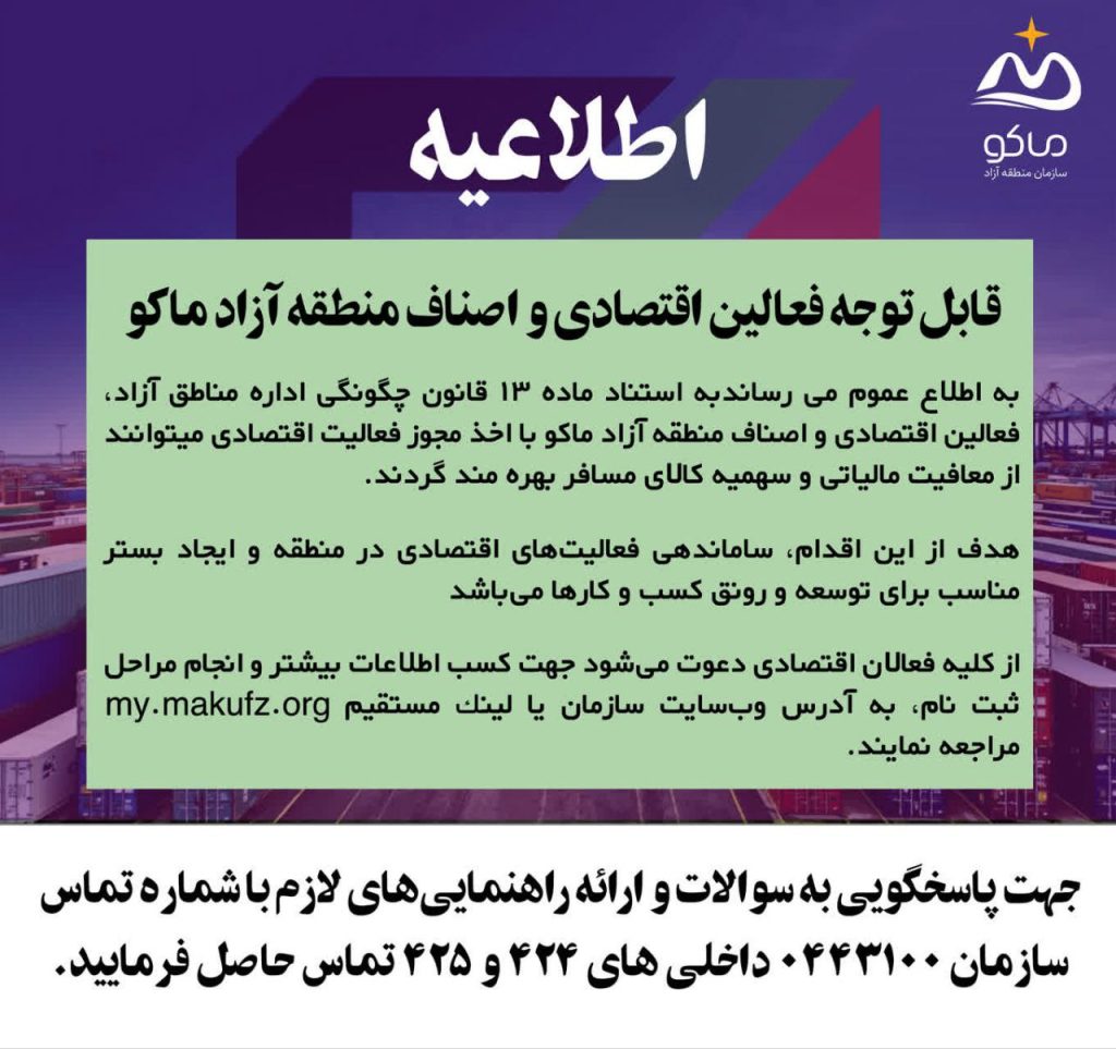 سازمان منطقه آزاد ماکو در راستای ساماندهی فعالیتهای اقتصادی، تسهیل فضای کسبوکار و حمایت از فعالان اقتصادی منطقه، از متقاضیان فعالیت اقتصادی دعوت میکند با اخذ مجوز فعالیت در منطقه آزاد ماکو از مزایا و مشوقهای قانونی بهرهمند شوند.